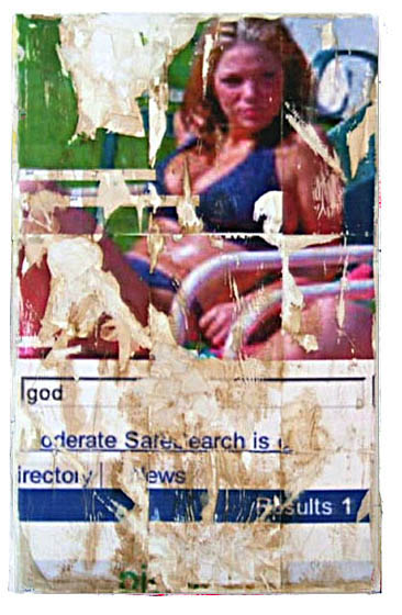 Launched in 2002, my “SEARCH” series is a 23-year exploration where digital search engine results become the raw material for textured, mixed-media narratives. It began with a simple idea: enter a single word—”human,” “hero,” “god”—and let the ranked images, shaped by global viewership, guide the canvas. As curator Amanda McGinnis noted in 2007, “MiE’s art is a reflection of our new digital reality in the formal arrangement of a rectangle,” capturing a moment unintentionally sculpted by an uncharted world society’s consensus. Back then, the algorithm’s purity delivered unexpected results that sparked my creativity, evolving over time into a gritty, graffiti-infused style with paper, acrylic, coffee, and spray paint.